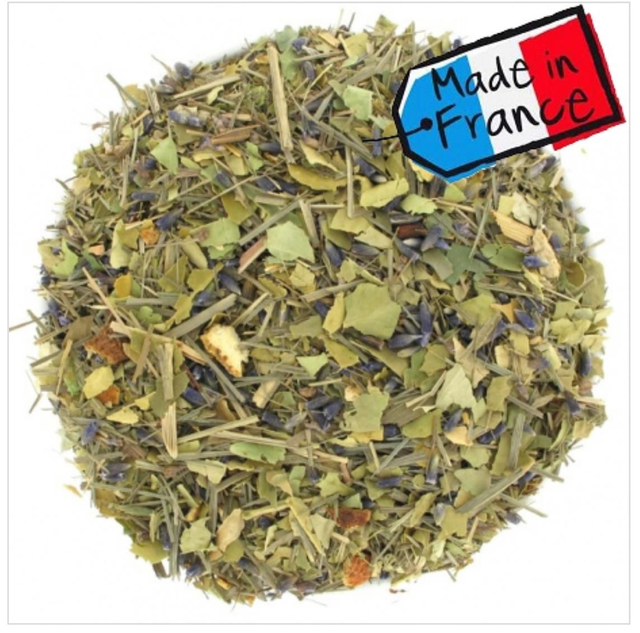 Feuilles d’oranger bigaradier, citronnelle coupée, fleurs de lavande, écorces d’orange, arôme naturel d’orange douce.