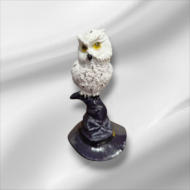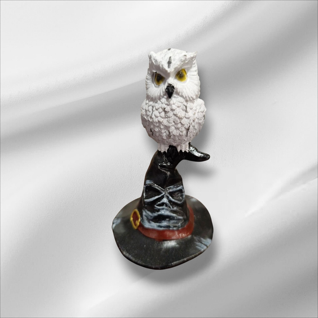 Plongez dans un univers enchanté avec cette superbe figurine de chouette perchée sur un chapeau de sorcier. Finement travaillée en résine, elle représente une chouette blanche majestueuse, symbole de sagesse et de clairvoyance, posée sur un chapeau pointu noir orné d’une boucle dorée.