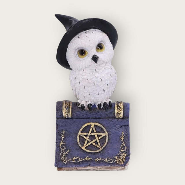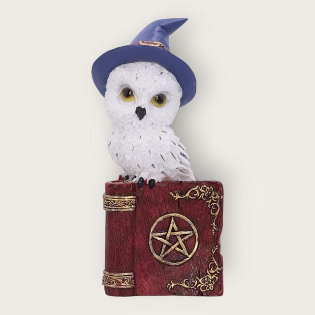 Finement sculptée, elle représente une adorable chouette blanche perchée sur un livre rouge ou bleu orné d’un pentacle doré, symbole de sagesse et de connaissance mystique.