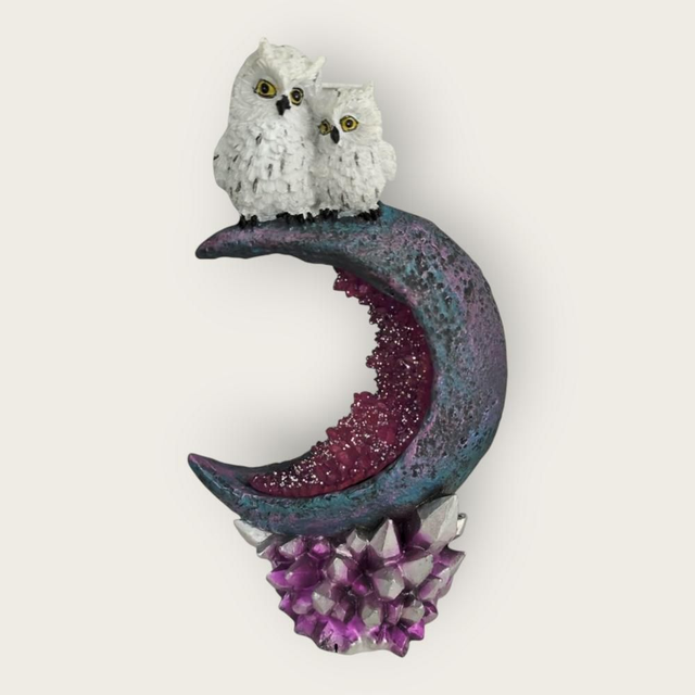 Deux chouettes sur lune cristallisée violette