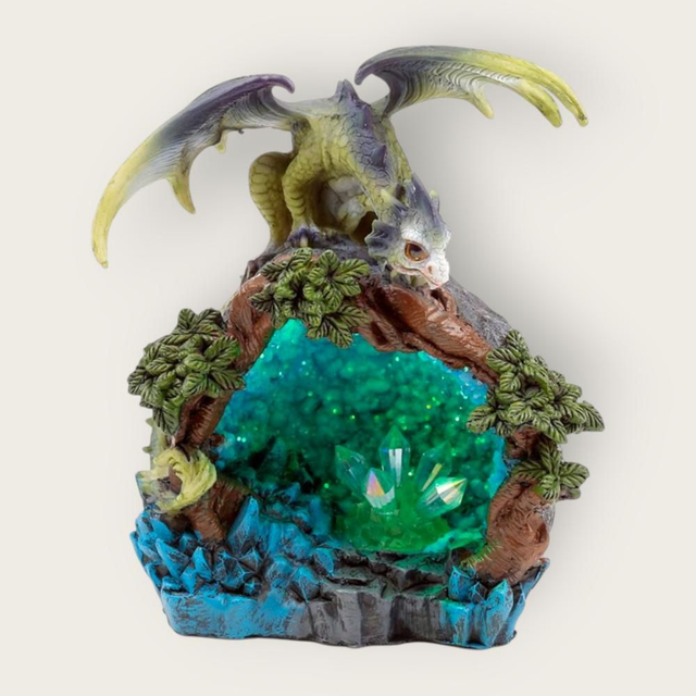 Le dragon, aux nuances jaune pâle et argentées, veille sur une cavité scintillante remplie de cristaux verts étincelants. L'effet lumineux diffuse une ambiance magique qui met en valeur chaque détail : roche texturée, feuillage finement sculpté et cristaux brillants.