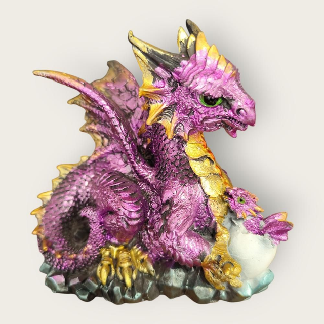 Découvrez une scène magique avec cette splendide figurine de dragon violet ou rouge veillant sur son bébé en train d’éclore.
