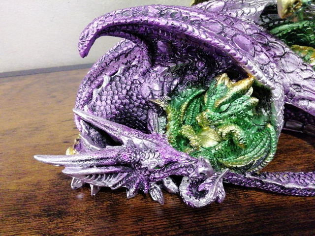 Ajoutez une touche magique à votre intérieur avec cette magnifique figurine de famille de dragons, mettant en scène un dragon protecteur vert et doré veillant sur un parent violet et leurs bébés.