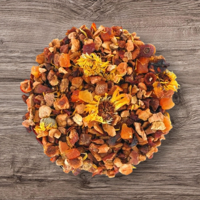 Morceaux de pomme, morceaux de poire, morceaux d’abricot, cynorrhodon, feuilles de souci, arômes naturels.