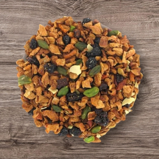 Pomme, pistache, raisin, chocolat blanc, amandes effilées, miel, arômes naturels.