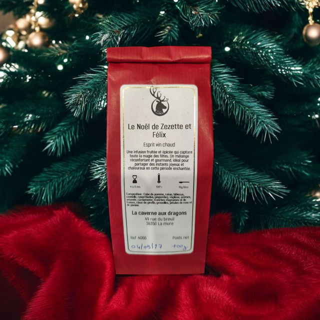 Plongez dans la magie de Noël avec l’infusion "Le Noël de Zezette et Félix", une création festive et chaleureuse signée La Caverne aux Dragons.