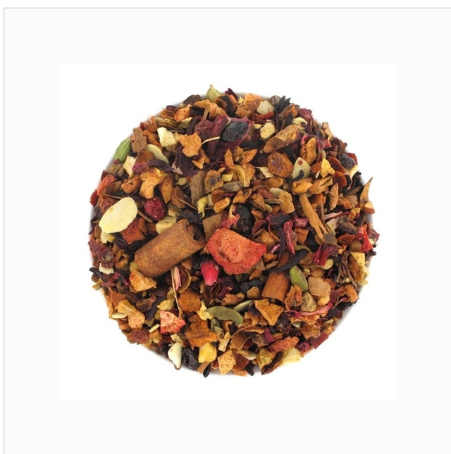 Inspirée du traditionnel vin chaud, cette infusion sans thé capture à merveille les parfums de fête : pomme, raisins, hibiscus et épices de Noël se mêlent pour offrir une boisson réconfortante et parfumée. Ses notes de cannelle, gingembre, réglisse et cardamome s’harmonisent à la douceur fruitée des groseilles, fraises et pétales de rose, pour un mélange aussi gourmand que convivial.