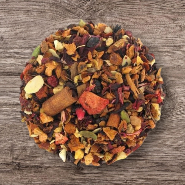 Inspirée du traditionnel vin chaud, cette infusion sans thé capture à merveille les parfums de fête : pomme, raisins, hibiscus et épices de Noël se mêlent pour offrir une boisson réconfortante et parfumée. Ses notes de cannelle, gingembre, réglisse et cardamome s’harmonisent à la douceur fruitée des groseilles, fraises et pétales de rose, pour un mélange aussi gourmand que convivial.
