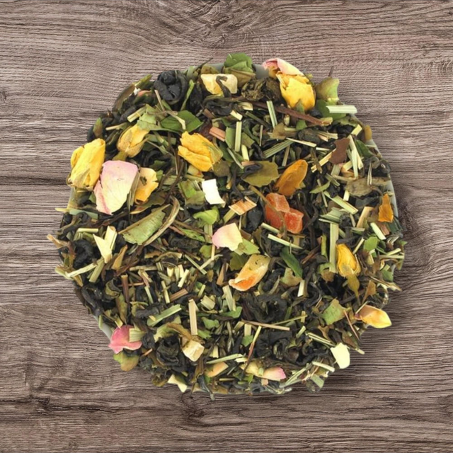 Thé vert du Vietnam, thé blanc Bai Mu Tan, citronnelle, papaye, orange, boutons de rose jaune, arôme de litchi, arôme naturel de fruit de la passion et de citron vert, pétales de bleuet roses.