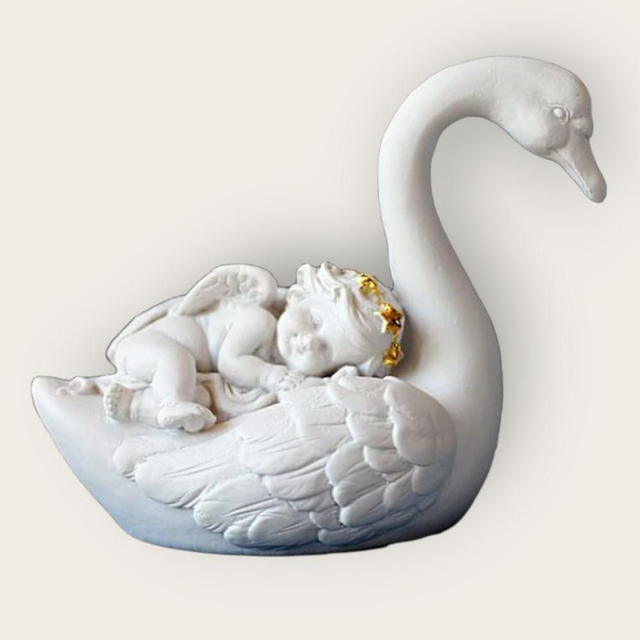Cette statuette délicate représente un ange enfant reposant ou assis sur un majestueux cygne, symbole de pureté, de paix et d’harmonie.