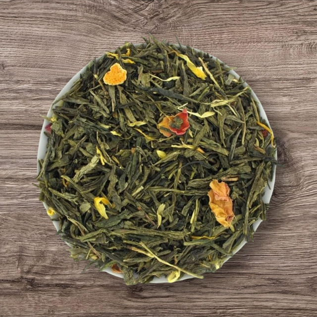 Thé vert de Chine, arômes de mangue, orange, fraise, rhubarbe, lavande, cubes d’orange, morceaux de mangue, pétales de souci, pétales de rose, rooibos.